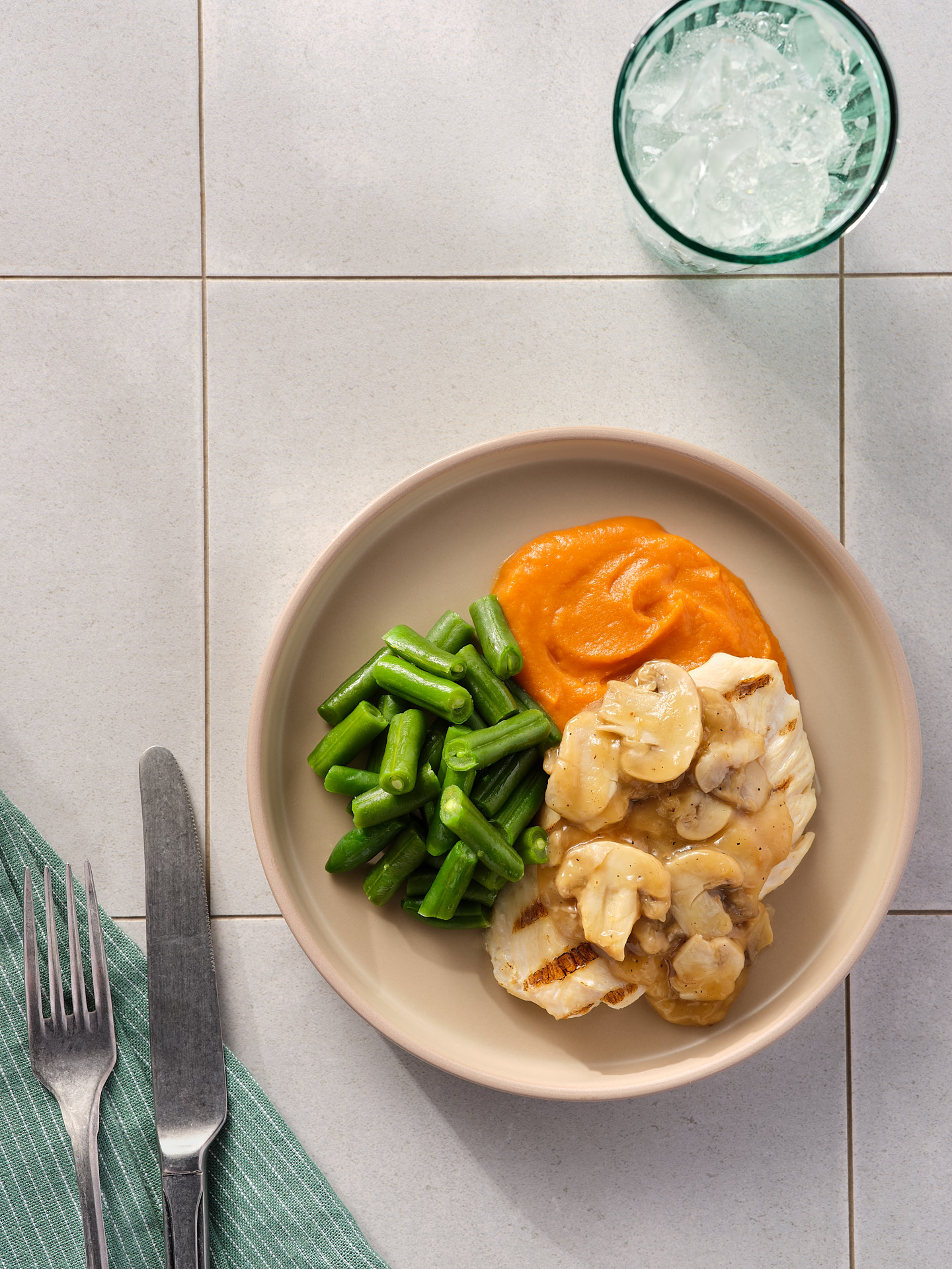 Tender, herbed chicken breast dressed in mushroom gravy. Served with sweet potatoes and French style green beans. Low Calorie, Low Fat, Low Sodium. (335g).