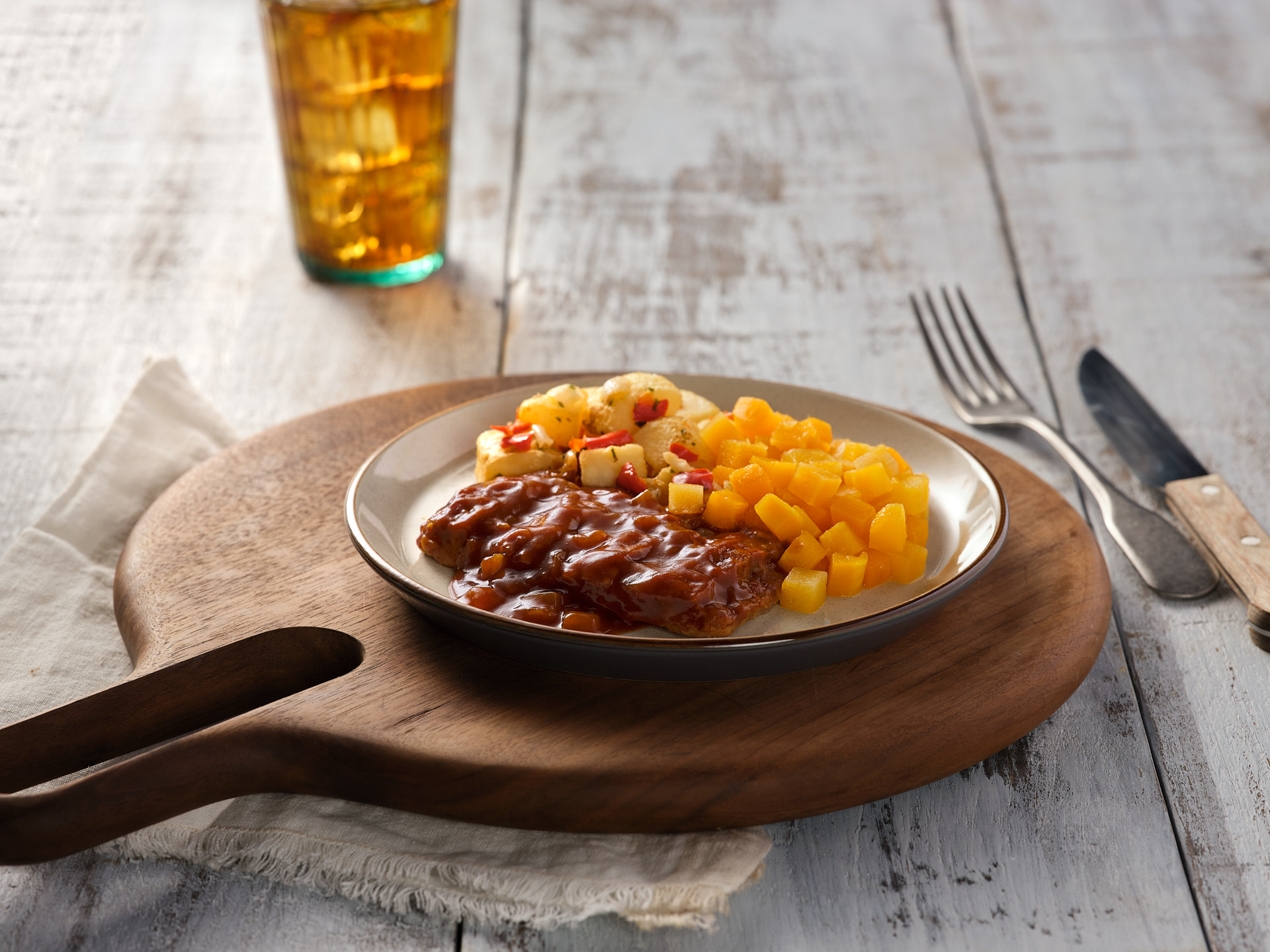 Rib-style pork cutlet dressed with a homestyle barbeque sauce, served with squash and home fried potatoes on the side. (320g)