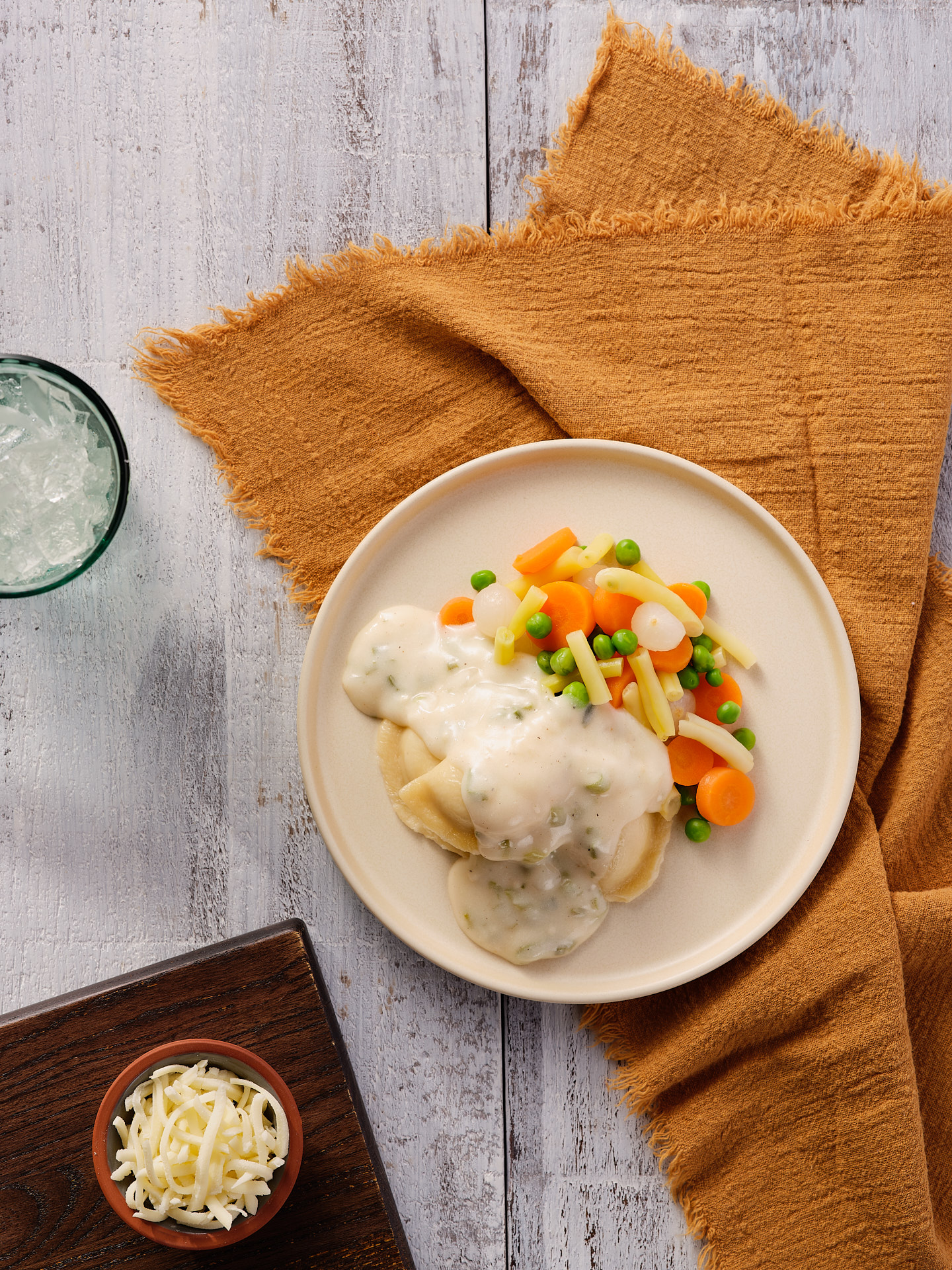 Tender potato-filled perogies blended with white cheddar, mozzarella, and Swiss cheese, topped with a rich sour cream and chive sauce. Served with a colourful medley of mixed carrots, peas, green beans, and pearl onions. Vegetarian. (285g)